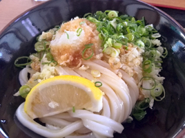 22日。丸亀競技場に入る前にさっそくうどんを1杯いただこうと、高松駅から徒歩1分の「めりけんや」へ。筆者が好きな食べ方はしょうゆ。冷たいうどんの上に大根おろしと絞ったレモン、薬味にねぎとしょうがとちょっとだけ揚げ玉を乗せて、しょうゆをかけていただく。冷たいうどんとしょうゆのシンプルさだけに麺の味と香り、食感がよくわかる。冷水できゅっと絞められたうどんは、もちもちとした歯ごたえがたまらない。やはり茹でたてはおいしい。ロケーション抜群なことから、高松滞在中に当店で計3杯のうどんをいただいた。