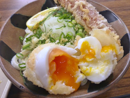 次いで向かったのは、JR高徳線栗林公園北口駅から徒歩10分ほどの「竹清 本店」。予想はしていたものの大行列。普段なら並んでまで食べるのも…と及び腰になるところだが、ここはあえて参加することに意義があると1時間弱ほど待ち、ようやく店内へ。こちらの名物もやはり天ぷらで、うどんに加えてちくわ天と半熟卵天を別途注文。注文を受けてからカラリと揚げる半熟卵天はあつあつさっくりで、半分に割ると黄身はトロトロ。この熱い天ぷらが冷たいうどんとベストマッチ。