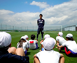 「ポジションはどこですか?」という質問に、「ディフェンダーってわかるかな? しっかり守る人です」と答える。言葉の選び方が優しい。得意なプレーを聞かれると、ヘディングをやって見せ、「ひと蹴りでどのくらい飛ばせますか?」の質問にキックを披露。また50m走のタイムを聞かれ、「6秒3」と答えた後、子どもたちと競争した。最後に「大人になるにつれ、乗り越えないといけない壁が出てくるかもしれませんが、小学生のうちに楽しさを知って、頑張ってください」とメッセージを述べた。