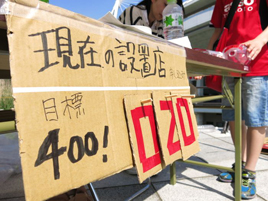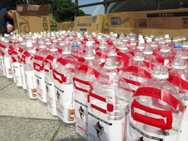 これは、空になった2リットルのペットボトルを集めて、募金を呼びかけるチラシ等を貼り付けるなど、洗浄や加工から設置場所の募集と管理まで、サポーターが自分たちで手と足を動かし、少しでも力になろうという思いを表したもの。この日は目標である400本に対して約300本のボトルが集まり、1つ1つに穴をあけて切り口を保護する作業等を行い、同時に設置場所を募った。