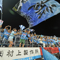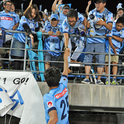 前半26分に富山に先制点を奪われるものの、8分後にソン・ハンキ選手のヘディングで同点。そして後半32分、この試合は後半途中からの出場となった岡村和哉選手が頭で押し込み2−1と逆転勝利を飾った。