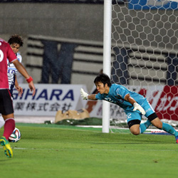 6月21日、Kankoスタジアムで行われた第19節・横浜FC戦で、プロ6年目のデビューを果たしたGKの椎名一馬選手。雨が降り続くゲームで、横浜FCの松下裕樹選手の鋭いグラウンダーのFKを止めるなど、すばらしいパフォーマンスを見せた。影山雅永監督は、試合後の記者会見で椎名選手についてこう話した。