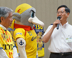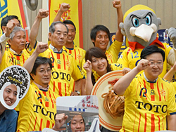 また小倉北区の横矢順二区長は「宮本選手のブロックと池元選手のゴールを期待したい。新スタジアムができると、魚町でサッカー談義が花咲くようになる。そのときにはJ1の舞台に立っていてほしい」と将来も見据えての激励。また北九州の『横』手敏夫社長の名前に掛けて「横横コンビでサポートしていきたい」と話して笑いを誘っていた。