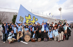 讃岐鬼誠会? その名前を初めて聞くと、硬派なツーリングクラブのような響きですが、地元高松市出身の北野誠監督がカマタマーレ讃岐の監督を引き受けた2010年に、中学時代の同級生たちが中心になって立ち上げた後援会の名前です。北野監督が高松市鬼無町出身ということで鬼無(きなし)町の「鬼」と監督の名前の「誠」を合わせて「讃岐鬼誠会」。J2ロアッソ熊本の監督から地域リーグに所属していた地元・讃岐の監督に就任した北野監督の心意気に、中学時代に同じグランドで汗を流したチームメイトが立ち上がったのです。そしてこの結成によって当時43歳の男たちには「Jリーグ参入」という共通の目的が生まれました。入場者数が伸び悩むクラブを後押しするために、応援ポスターの作成・ブログでの情報発信・応援のぼりと大応援旗の作成、ホームゲームはもちろんアウェイゲームへはバスツアーを企画してスタジアムで応援するほか、勝利監督賞を送って監督を支援しました。その活動はマスコミにも取り上げられるほどで、地元・鬼無町を中心に現在約130名の会員がいます。