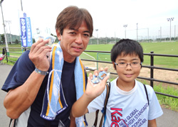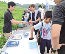 続いて丸く穴の空いた箱が登場。中をのぞいてみると、監督や選手の顔がプリントされたオリジナル缶バッジ。この缶バッジも参加者へのプレゼントとなっているが、手を箱に入れてランダムに選ぶようになっており、お目当ての選手がGETできるかどうか、ちょっとした運試しにもなっている。「おっ、これはまだ持ってないゾ!」と喜ぶお父さんや「K監督いいなぁ…。お願い、私のT選手と交換してくれない?」と、友だち同士でバッジを交換する姿も見られた。
