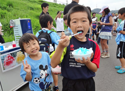 グッズプレゼントだけではなく、その後はかき氷がふるまわれ、参加者はそれを頬張りながらトレーニング風景を見学。この日は京都戦の前日ということもあり、練習を見ながらそれぞれの場所でサッカー談議に花が咲いていた。イベントの最後にはプチサイン会が行われ、持参したユニフォームや色紙、さらに今日プレゼントされたうちわや下敷き、缶バッジへサインをしてもらう参加者もおり、選手もトレーニングを終えた直後にも関わらず、サポーター・ファンとの交流を楽しんでいた。