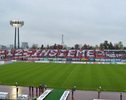 2014年11月1日、第39節・ホーム京都戦。このゲームのキックオフ前、サポーターによるコレオグラフィーが、岡山で初めて実施された。雨の中、バックスタンドのホーム側全体を使って、彼らが描き出した文字は「12 INSIEME」。「INSIEME」とは、イタリア語で「一緒に」を意味する。岡山が地域リーグを戦っていた時から、サポーターのコールリーダーである岡本透さんはこの言葉をよく使ってきたと聞く。そして、より岡山らしい表現の「ココロヒトツニ」という言葉は、横断幕にも描かれている。