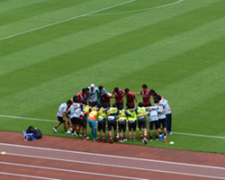 サポーターが見守り、後押しする2014シーズンの岡山は、そんな「ココロヒトツニ」を感じさせるシーンが多い。4月20日の第8節・北九州戦から始めた、先発、控え選手、監督、コーチ、ドクターらスタッフ全員による、サイドラインを挟んでの円陣もそのひとつだ。また、石原崇兆選手がチームの団結を感じるのは、「試合の翌日にスタメンのグループで、昨日はこうだったね、と話す時」だと言う。「タダシ君(竹田)とか、コータ君(上田)も多いかな。あとはリョウ君(田所)とかが、『ちょっといい?』って感じで話をして、そういうことがすごく次に繋がってきてるなと思います。みんなフレンドリーだし、真面目で、それでいい方向に向いて来たと思います」。