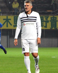 後半は中島の見事なループシュートでレジェンドユニティチームが先制すると、レジェンドジェフィチームは松原が櫛野に倒されて得たPKをルーファーが決めて同点。その後はディフェンスラインの背後にフリーで飛び出した村井が櫛野と1対1になるが、グラウンダーのシュートが惜しくもゴールポストの横に外れて、ガックリと崩れ落ちた村井を櫛野が慰めるという微笑ましい場面もあった。事前に集まっての練習などしていないのに華麗なパスワークや連動した守備も見られ、「さすがだな」と思わされる場面が何回もある中でついに決勝ゴールは生まれることなく、試合は1−1の引き分けに終わった。