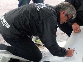 午前中は雨が降ったためクラブハウスの2階のテラスへ上がれる階段の下に置かれた『一戦必勝』の横断幕に、千葉のクラブスタッフや報道陣が寄せ書きをした。