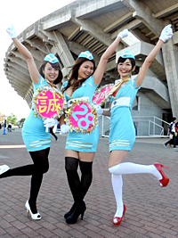この日、セクシーキャビンアテンダント姿で登場したのは、みさとさん・なるさん・きよさん。「イメージは『J2残留へご案内します』って感じかな」と3人。最初は、みさとさんとなるさんが愛媛戦の前日にハロウィンパーティーに仮装して出かけ、「楽しいから、明日の試合もこの姿のままで行っちゃおうか」という軽い気持ちからだったそうですが、たくさんの人に声を掛けられたり、子どもたちから「一緒に写真を撮って」とせがまれたりして、「これは試合の盛り上げに一役買うことができるかも…」とこの日も再登場。「私も一緒に盛り上げたい」と、きよさんも初参戦することになりました。