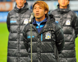 選手からも挨拶が行われ、キャプテンの野口遼太は「僕たちにはまだ大事な試合が2試合残っています。この試合に勝って残留するためにも、より一層の応援をよろしくお願いします」と語り、選手会長の石井健太は「ホームゲームの開催にあたり、多くのボランティアの方にご協力いただき、選手一同感謝しております。来週からは入れ替え戦がありますが、絶対残留したいと思います」と続いた。