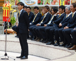 あいさつをしたのは5番の前田和哉キャプテンが大トリだったことを除いて背番号順。ということで、もちろん序盤戦で火を付けたのは「インフルエンザが流行っているので、うがい、手洗いをしっかりやってください!」とサッカー以外の話を始めた宮本亨選手(背番号2)。続く渡邉将基選手(3)は「キタキュー大好きです!」と言ったあと、座るときにパイプ椅子を座り損ねて転げてみせ、背番号順のすでに2と3の段階でヒートアップ。