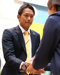 握手を交わす松本拓也選手。クラブやホームタウンの盛り上げに向けてアイデアをひねってきた一人だ