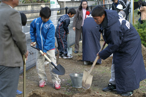 その後、今日は「サルスベリ」の木を子ども達と一緒に植樹し、楽しみながら、木を植えていきました。2選手とも真剣に「サルスベリ」の木に泥を被せていました。