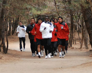 イブラヒム・タンココーチを先頭にランニングを行なう選手たち