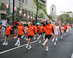 今年が3回目の参加となるオレンジウェーブは、オレンジ色のハッピを着て鮮やかに踊り、注目を集めていました。ダンススクール生も、“お姉さん”に負けじと、オレンジウェーブ顔負けの踊りを披露。元気一杯の踊りに沿道からも声援が湧いていました。