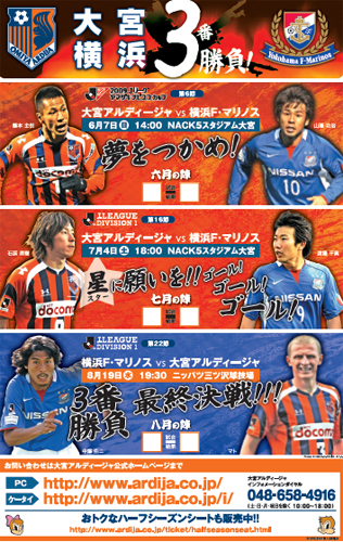このたび大宮アルディージャでは、6月7日(日)、7月4日(土)、8月19日(水)に開催される大宮アルディージャ対横浜F・マリノスの3試合を「大宮・横浜3番勝負」と称し、入場者数拡大に向けて横浜F・マリノス様と共同でプロモーション活動を行うこととなりましたので、お知らせいたします。