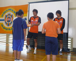 そして、次のコーナーでは、児童の皆さんからたくさんの質問が出ました。「エスパルスに入って嬉しかったことは何ですか?」との問いに、原選手が「勝った時、仲間やオレンジサポーターと勝利をわかちあえることです」と答えると、児玉選手は「負けて悔しかったですが、昨年のナビスコ決勝で国立で試合ができたことです。それから静岡に来ておいしいものをたくさん食べられることかな」と返し、笑いを誘いました。