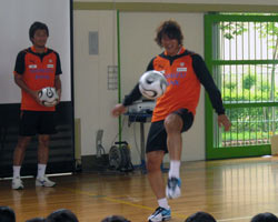 エスパルスのテーマ曲が流れる中、会場である体育館に二人が登場すると、大きな拍手が。両選手の自己紹介の後はリフティングのお手本を披露すると、会場からは大きな歓声が上がりました。