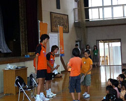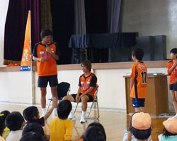 質問コーナーでは「どうすればサッカーが上手くなりますか?」との問いに、長沢選手が「自分の欠点を見つめて、毎日少しずつでも直していくことです。」と答えれば、永畑選手は「いいシーンをDVDなどで見て研究してきました」とエールを贈ります。最後に二人は夢を持つことの大切さを語り、児童たちに長沢選手からは「挫折や苦しいときもありました。でも夢に向かって毎日あきらめずにコツコツ努力すればかないます」。永畑選手からは「あきらめずに頑張れば必ず夢はかないますよ」と力強いメッセージが発せられました。