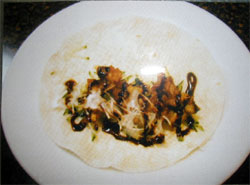 ★「チャイニーズクレープ 」 300円(中華料理なかむら) カリカリに揚げたトリカワ&生野菜とオリジナルソースを焼鴨餅(カオヤーピン)北京ダックの皮でサンドした手軽なSeoul Food!