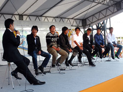 そして、いよいよOB選手7名の登場です。大勢の方の温かい拍手に迎えられ、スタジアムDJ鈴木克馬氏がMCを務めるトークショーでは、1999年のリーグ優勝の話や各々の現況など、様々な話題でこの10年を振り返りました。