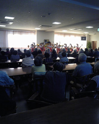 食堂に集まった入所者の方、スタッフの方約50名の前でジュニアユースのメンバーが元気にダンスを披露すると、一緒に踊ってくださるスタッフの方もいて、入所者の皆さんも手拍子で盛り上がってくださいました。ダンスショーが終了すると「アンコール」の声が掛かり、ご要望に応えて急遽もう一曲ダンスを披露しました。