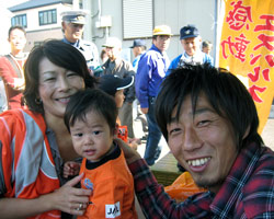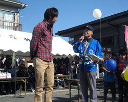 青空の広がった11月1日(日)、市川大祐選手が、第25回入江ふるさと祭りに参加しました。会場となった入江生涯学習交流館には、たくさんの屋台が立ち並び、朝から大勢の人で賑わっています。司会者のアナウンスで市川選手が登場すると、大きな拍手と歓声が。