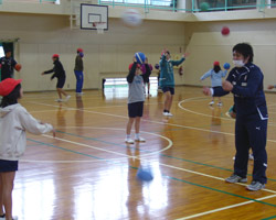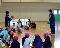 小学校の授業2コマ分を利用し、前半は「ゲームの時間」、後半は「トークの時間」。前半は体育館で行なわれ、夢先生の興津先生、アシスタントの山崎先生がジャージ姿で登場し、ボールを使ってのウォーミングアップや鬼ごっこを通じて、仲間と協力することや相手を思いやるこころ、フェアプレー精神の大切さを伝えました。