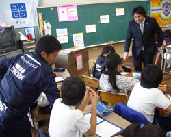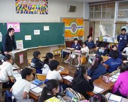 後半は教室で、スーツに着替えた興津先生が『夢曲線』を使って、「プロサッカー選手になりたい」という自身の夢を実現するまでの体験を話し、児童とともに夢について語り合いました。ゲームの時間で先生たちと意気投合した児童が活発に意見を述べる中で、興津先生が「夢を持って、(実現)できなかったらどうしようと考えることなく、自分がこうしたいと強く想うことが大切」と言ったときの児童の真剣な眼差しが印象的でした。授業の後半には、「サッカー日本代表になりたい」「お母さんのように看護師になって病気の人を助けたい」「東大で勉強したい」など、児童が自分の夢を語ってくれました。