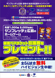 上記デオデオ対象店舗にて、スカパー!HDまたはスカパー!e2にお申込みいただいた方を対象に、『サンフレッチェ広島ホームゲーム観戦ペアチケット引換券』を先着1,000組2,000名様にプレゼントします。