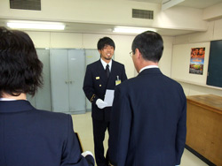 次に、通常点検の指揮を行ないます。市民の生活を守っている消防署員の皆さんの迫力ある点検・点呼に、圧倒される場面もありましたが、しっかりと敬礼を交えながら指揮をとっていました。そして、署員を前にして、「サッカーも優れた選手一人だけでは試合に勝つことができません。皆さんのチームワークで、市民の安全・安心のため、これからも頑張ってください」と、訓示を読みあげました。また、署内には多くの子どもたちが訪れ、普段とは違った服装の山本真選手に驚きながらも、ふれあいを楽しんでいました。