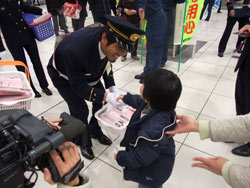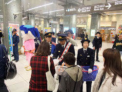 最後に、場所を静岡駅コンコースへと移し、署員の皆さんと住宅火災警報器設置促進のリーフレットを配布し、市民の皆さんに防火を呼びかけました。