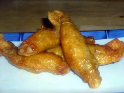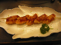 5ヶの餃子を串にさして、カラッと揚げました。アツアツのうちに召し上がれ!