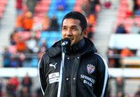 「どうも、みなさんこんちわ。本当に長い間、18年間という素晴らしい時間をエスパルスで過ごすことができました。本当に長い間、熱いご声援ありがとうございました。ただ、こんな挨拶すると引退するみたいなんですけど、まだ引退はしないんで、まだまだ選手として頑張りたいと思います。本当に長い間ありがとうございました。」