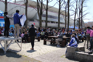 4/17(日)に行われたイベントにはたくさんの人からご来場いただき、復興支援活動へご賛同いただきました事に深く感謝申し上げます。トレーニングゲーム前に行われたチャリティオークションでは、チームの各選手からサイン入りのスパイクなどが出品され、最高値で70,000円の値段がついた物もあり、終始競り合いが繰り広げられていました。