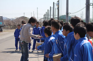 者へ募金のお願いを呼びかけました。ブラウブリッツ秋田とのトレーニングゲームは2戦中とも負けでしたが、ホーム開幕のセレッソ大阪戦に向けて【粘強】頑張っていきますので応援よろしくお願いします!