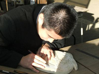 (1)木型の製作:まずはノミを使って木型を作りました。
