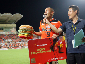 ヒーローインタビューに続き、「WOWプレーヤー」に選出されて雄叫びを上げる高原直泰選手。