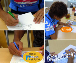 方法/サポーターズブースでF!クラブ会員証をご提示ください → 投票用紙をお受取ください。 → お好きな絵(気に入った絵や上手い、面白い絵、オリジナリティなど)を3つ選んで○印を付けてください。 → 指定の投票箱へ投函ください。