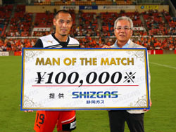マン・オブ・ザ・マッチに輝いた高原直泰選手(左)とプレゼンターの静岡ガス戸野谷宏社長(右)