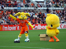 試合前には「ひよこちゃんぬいぐるみ」(日清食品提供)の投げ入れプレゼントも行なわれました