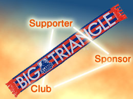 そして、もう一方の面には、ビーズインターナショナルからのメッセージとして「BIG TRIANGLE」の文字が。サポーター、スポンサー、そしてクラブが三者で助け合う関係を作ることが、クラブを強くする―。2000年、ユニフォームスポンサーとして支えていただいて以来、常にクラブとともに闘い続けてくれた、ビーズインターナショナルならではの願いが込められたメッセージを、ぜひスタジアムで掲げてください。