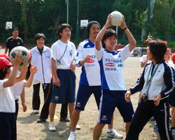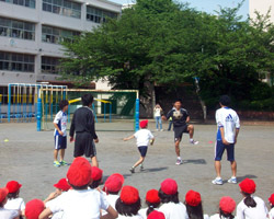 しりとりを行いながら頭上でボールを受け渡すリレーが行われ、小椋選手、松本翔選手は先生との混合チームで子どもたちとの勝負に挑みました。 結果は・・ ぶっちぎりの優勝! 勝負に全力で挑む小椋選手、松本翔選手でした。