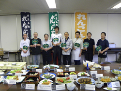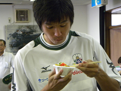 羽島市の特産であるれんこんを使った約15種類のれんこん創作料理を試食させていただきました。日頃、れんこんをあまり食べる機会のないと言っていた村尾選手も、れんこんの食感を堪能しながら、何度もおかわりをしていました。葉に水を注いで茎から飲む象鼻杯も体験させてもらいました。参加していただいた皆様よりFC岐阜へ募金もしていただきました。