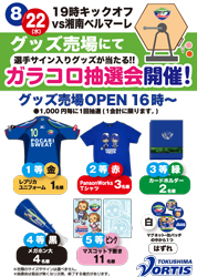 ホームゲーム会場グッズ売店で1,000 円(税込)お買い上げ毎に1 回ガラコロ抽選会に参加できます。