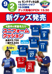 このたび、弊クラブでは、9月2日 vsモンテディオ山形より、新グッズ「ユニフォームクッション」、「シュシュ」、「PRIDE OF TOKUSHIMA ロングT シャツ」をホームゲーム会場グッズ売り場にて販売することとなりました。