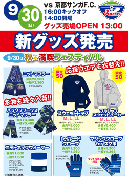 このたび、9月30日(日)vs京都サンガF.C.より、新グッズ「ニットマフラー」、「Pansonworksニットマフラー」、「ニットネックウォーマー?」、「スウェットトップ」、「フルジップスウェットパーカー」、「レイヤードグローブ」、「マジックグローブforスマホ」、「ユニフォームクッション」をホームゲーム会場グッズ売り場にて販売することとなりました。