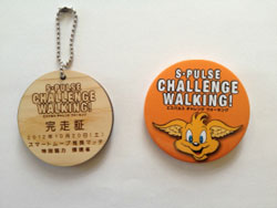 完歩した先着(ゴールに到着した順)1,000名の参加者にもれなく、『エスパルスチャレンジウォーキングオリジナル缶バッチ』をプレゼントいたします。さらに、先着50名(ゴールに到着した順)の参加者にはもれなく、完歩証(静岡市産の間伐材にて制作)をプレゼントいたします。